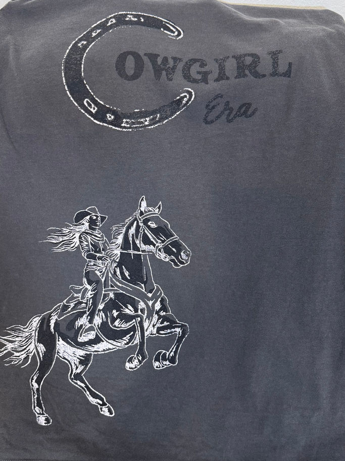 Step into your Western era with our Cowgirl Era Graphic Tee — the perfect blend of comfort, style, and cowgirl spirit. This oversized charcoal tee features a bold hand-drawn illustration of a cowgirl riding a rearing horse, paired with a vintage horseshoe graphic for that authentic Western vibe.