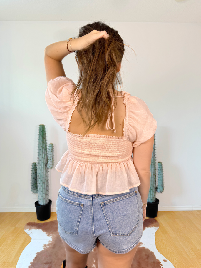 Embrace effortless Western charm with our Front Porch Flirt Top. This soft blush top features a flattering sweetheart neckline, flirty cap sleeves, and a front-tie detail that adds a touch of femininity to any outfit. The cinched waist and peplum hem create a beautiful silhouette, perfect for pairing with denim skirts or your favorite high-rise jeans. Lightweight and versatile, it’s the perfect piece for everything from rodeo nights to brunch on the ranch.