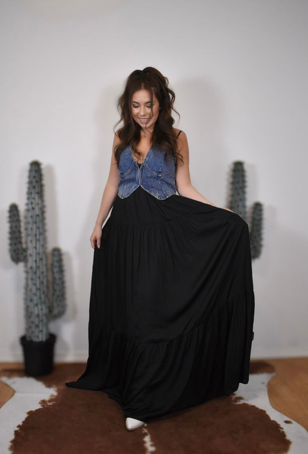 Turn heads in the Saddle and Silk Maxi where western charm meets sleek sophistication. Featuring a faux leather bustier-style top and a flowy maxi skirt with a side slit, this dress is perfect for a night out, concerts, or any occasion where you want to stand out. Pair it with your favorite cowgirl boots for a bold country look or dress it up with heels for effortless elegance.